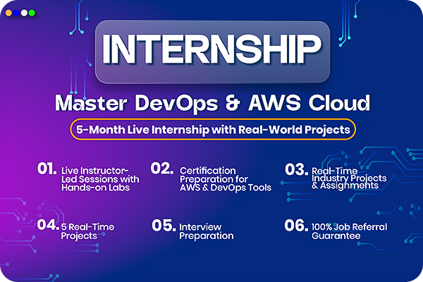 Join our 5-month live instructor-led internship on DevOps and AWS Cloud Computing, designed to make you industry-ready! This hands on program covers real-world DevOps tools, AWS cloud fundamentals, and 5 practical projects, helping you gain job-ready skills. Whether you're a beginner or an IT professional looking to upskill, this program will equip you with CI/CD pipelines, Docker, Kubernetes, Terraform, AWS services, and more. Don't miss this opportunity to build your career in Cloud & DevOps with expert mentorship!